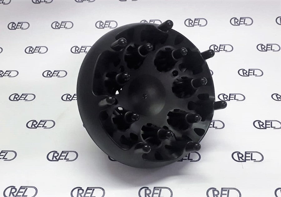 Diffusore professionale con fori di uscita che consentono la distribuzione uniforme dell'aria per asciugare delicatamente e definire i ricci. Le 14 dita arrotondate sono delicate sulla cute e raccolgono i capelli per un'asciugatura composta che dona elasticità ai ricci
