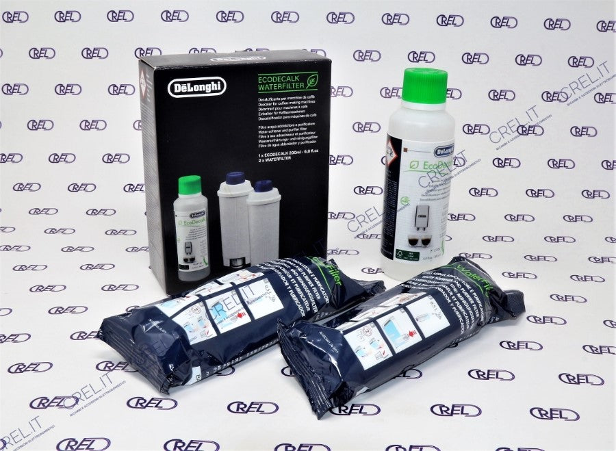 Filtro acqua per macchina da caffè DeLonghi. Migliora la qualità dell'acqua utilizzata utilizzata riducendo il calcare, esaltando con il sapore del caffè e preservandone l'aroma. Migliora la prestazione e l'efficienza della macchina, evitando malfunzionamenti dovuti al calcare.Decalcificante per macchina da caffè. Il Decalcificante Naturale Liquido EcoDecalk per Macchine da Caffè automatiche ed espresso della DeLonghi è un prodotto molto efficace ed a base esclusivamente di componenti naturali, totalmente biodegradabile, non corrosivo, e non aggressivo.